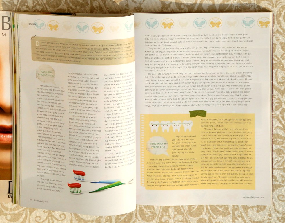 Disinilah perawatan gigi menjelang pernikahan memainkan peranan. Begitu banyaknya faktor yang difikirkan oleh calon pengantin, mulai dari urusan busana hingga kedekorasi pesta, menyebabkan perawatan gigi menjadi nomor kesekian, atau bahkan terlupakan begitu saja. Padahal untuk menghadirkan senyum dan tawa yang mempesona, diperlukan paling tidak pemeriksaan secara rutin dan berkala ke klinik dokter gigi. Faktor – faktor seperti makanan dan minuman, juga kebiasaan buruk merokok tak hanya menghilangkan senyum yang indah, tetapi juga merusak warna dan komponen gigi.